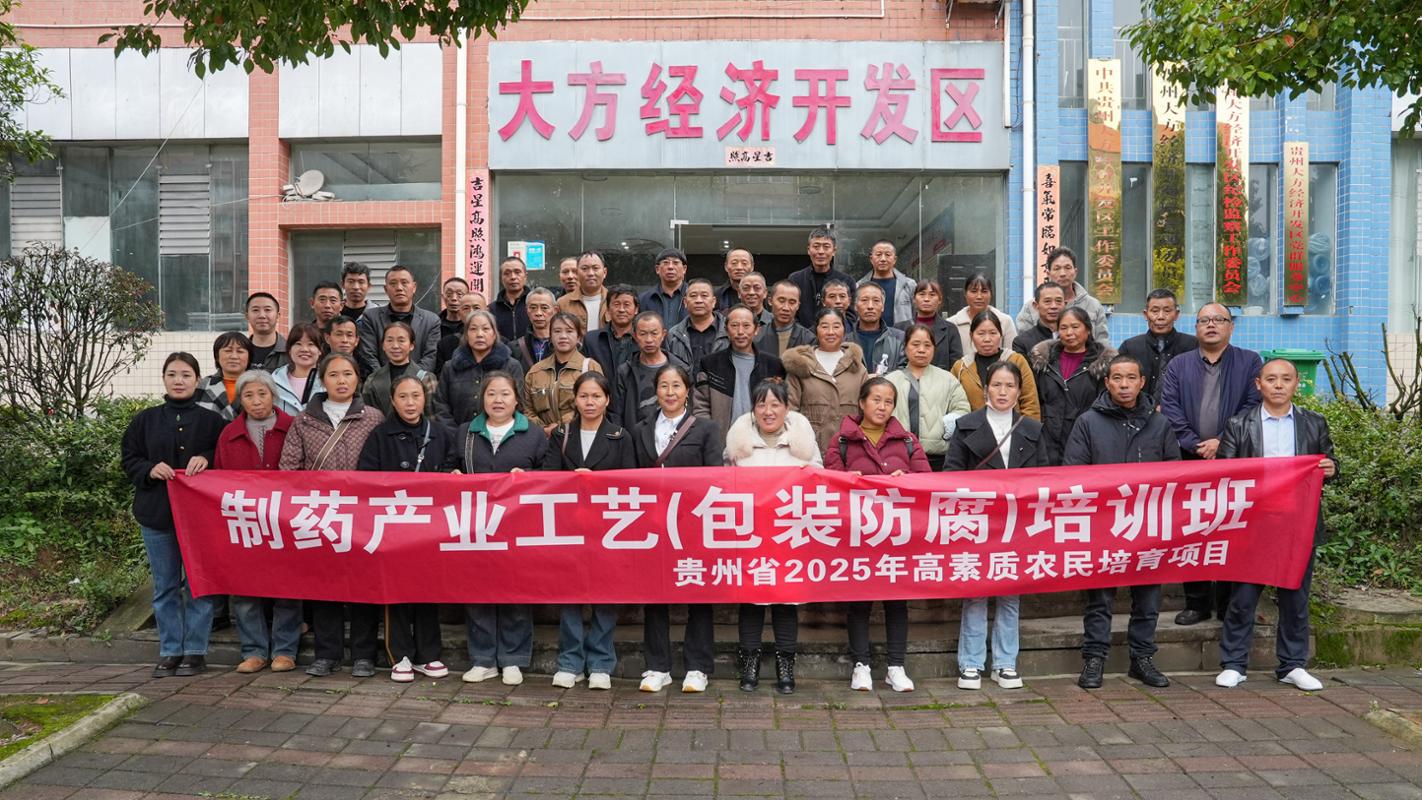本网讯 2025年11月8日,由贵州省农业农村厅指导、贵州师范学院化学与材料学院承办的2025年高素质农民培育制药产业工艺(包装防腐)培训班在遵义市凤冈县石径村圆满落下帷幕。50名学员,经过为期5天的系统性培训,带着专业技能踏上产业升级新征程。此次培训是落实“人才强农、科技兴农”战略的具体实践,为乡村产业高质量发展注入了坚实的人才动能。