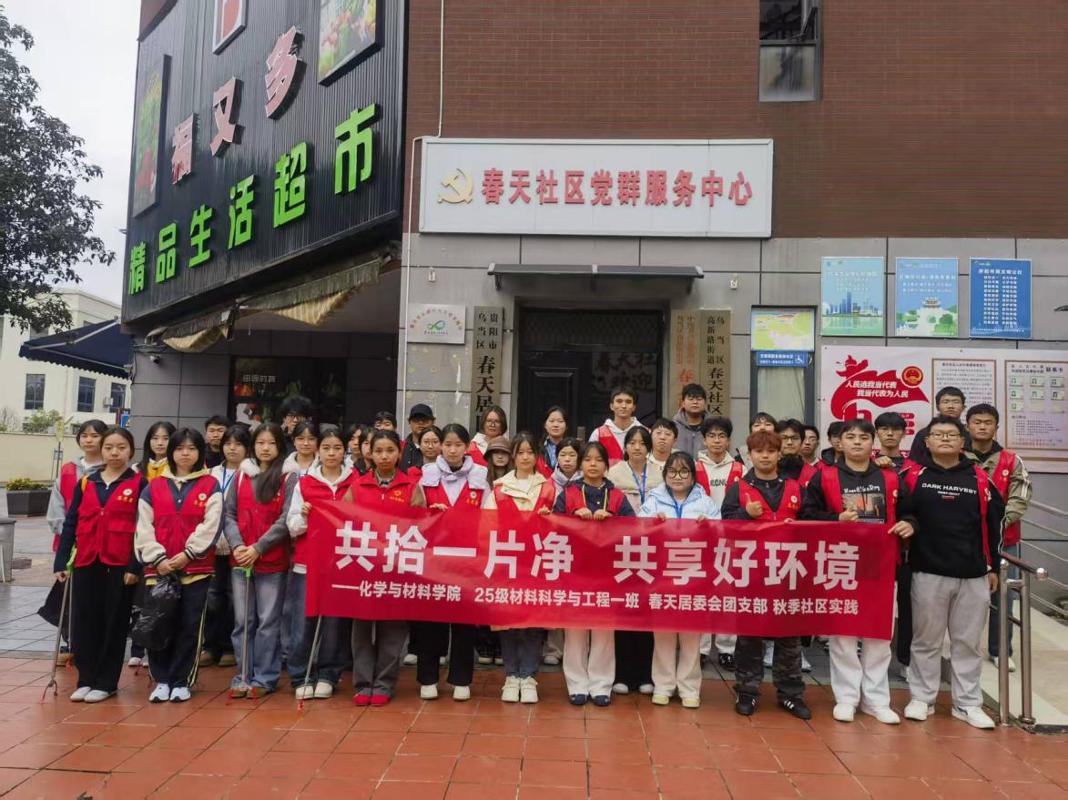 本网讯 为深化社会实践育人成效,引导青年学生在服务社会中增长才干,2025年12月2日,化学与材料学院2025级材料科学与工程一班四十名同学走进春天社区,开展“共拾一片干净,共享好环境”主题志愿服务活动。