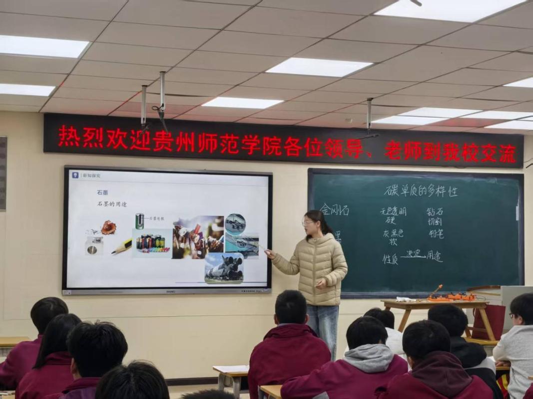 本网讯 为提升实习工作质量与成效,进一步密切与实习基地的交流协作,深入了解中学对化学师范人才培养的实际需求,更好发挥我校服务地方基础教育的作用,12月16日,化学与材料学院副院长李艳莹、化学专业负责人江雪清及化学系教师文君、吴婕、孙成涛、徐海丽、王婕一行前往贵阳市第十九中学,看望该校实习生并开展化学专业人才培养方案调研。贵阳市第十九中学副校长刘婷、教科副主任王秀琼、化学教师杨镇钢、胡璐瑶以及我院实习生共同参加了本次教研活动。