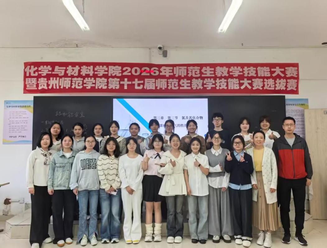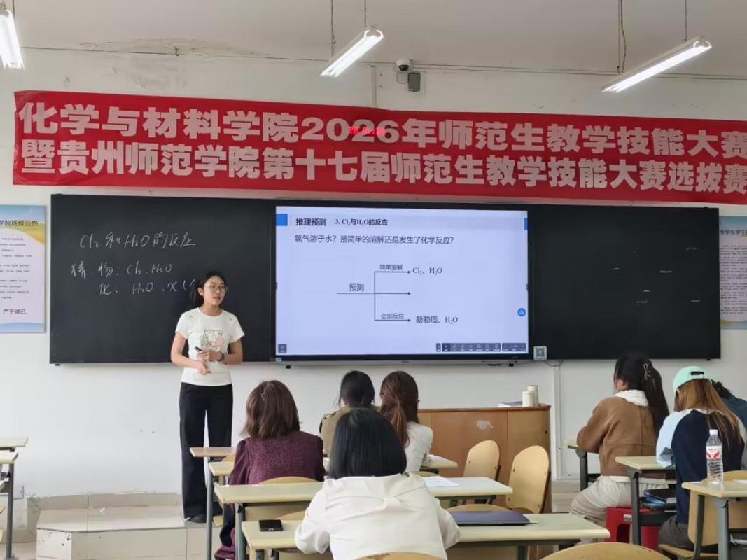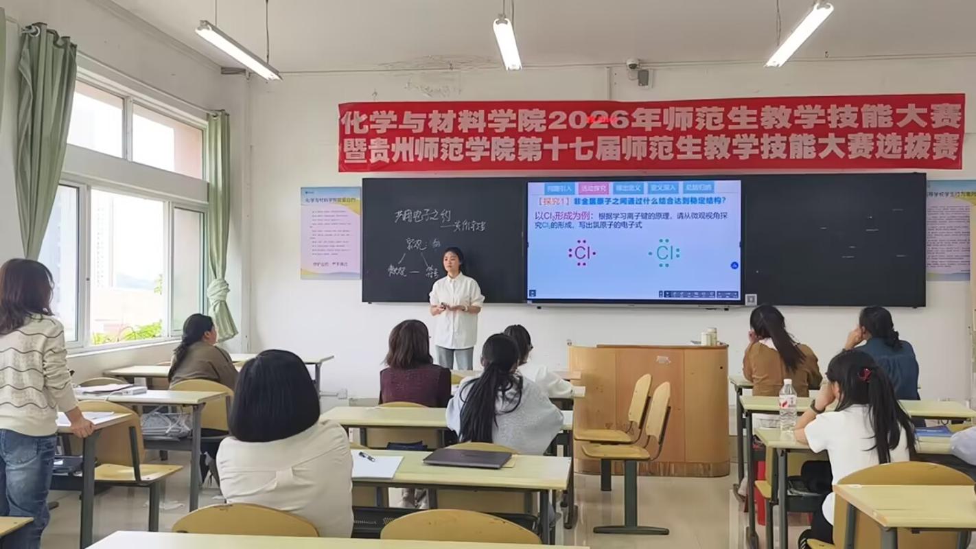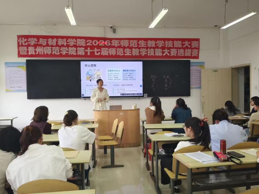 本网讯 为夯实师范生教学基本功,提升教育教学实践能力,展示化学专业教学改革成果,2026年4月20日,化学与材料学院在宁静楼528教室举办了2026年师范生教学技能大赛暨贵州师范学院第十七届师范生教学技能大赛选拔赛。学院副院长李艳莹、化学系教师文君、武汉清、吴婕、江雪清担任评委。经班级初赛选拔,共有9名化学优师生和9名化学师范生参加本次比赛。